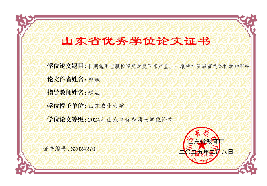 山东省优秀硕士学位论文-长期施用包膜控释肥对夏玉米产量、土壤特性及温室气体排放的影响