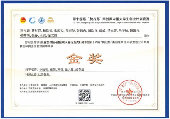 豆志昂扬——耐盐碱大豆行业先行者 第十四届“挑战杯”秦创原中国大学生创业计划竞赛 金奖