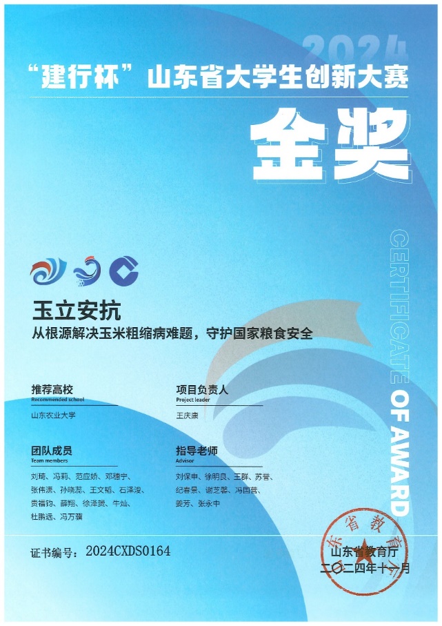 玉立安抗一一从根源解决玉米粗编病难题,守护国家粮食安全 (建行杯)山东省大学生创新大赛(2024) 金奖