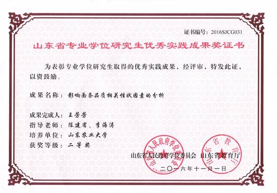 山东省专业学位研究生优秀实践成果奖 二等奖 影响面条品质相关性状因素的分析