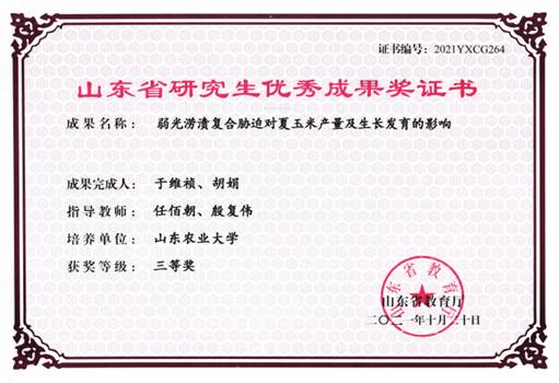 山东省研究生优秀成果奖 三等奖 弱光涝渍复合胁迫对夏玉米产量及生长发育的影响