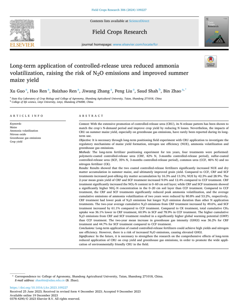 Long-term application of controlled-release urea reduced ammonia volatilization, raising the risk of N2O emissions and improved summer maize yield. Field Crops Research