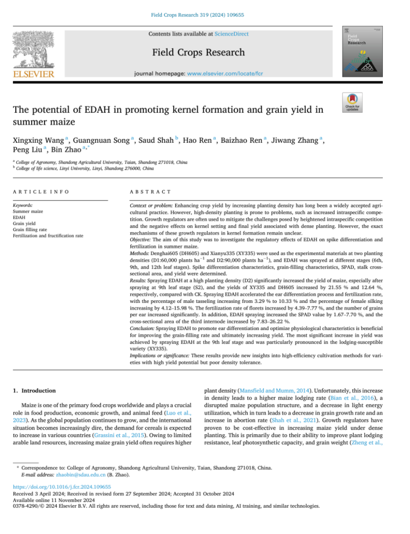 The potential of EDAH in promoting kernel formation and grain yield in summer maize. Field Crops Research