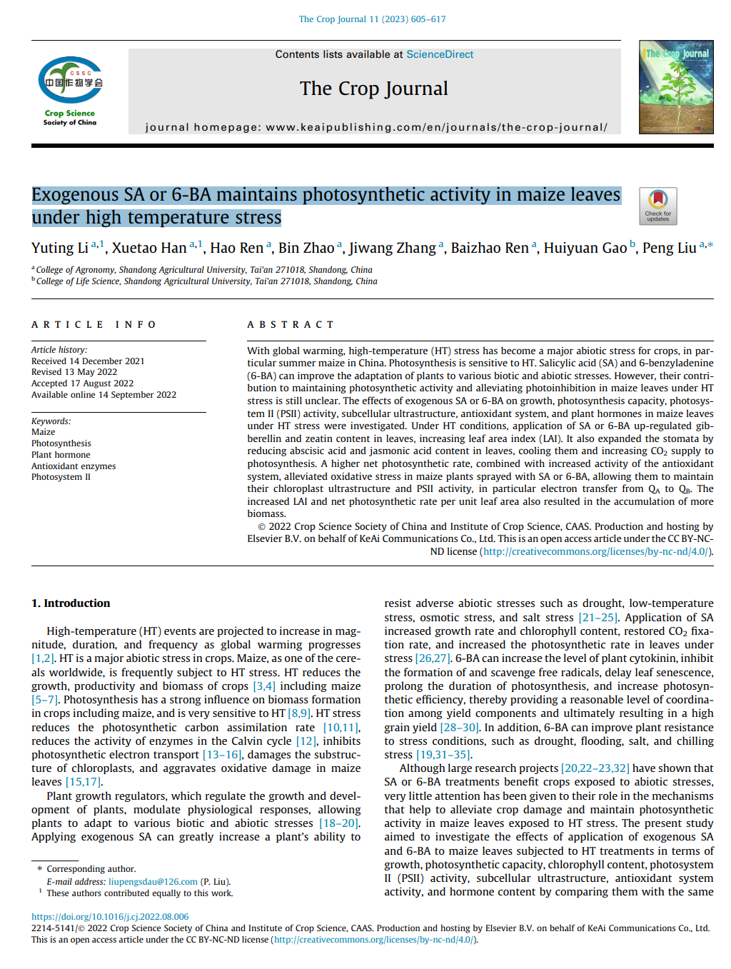 Exogenous SA or 6-BA maintains photosynthetic activity in maize leaves under high temperature stress. The Crop Journal