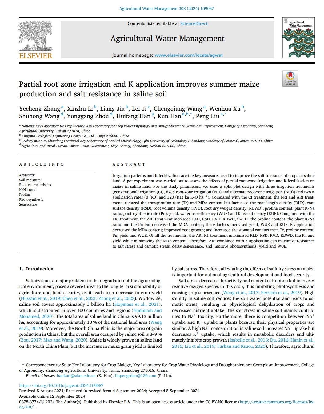 Partial root zone irrigation and K application improves summer maize production and salt resistance in saline soil. Agricultural Water Management