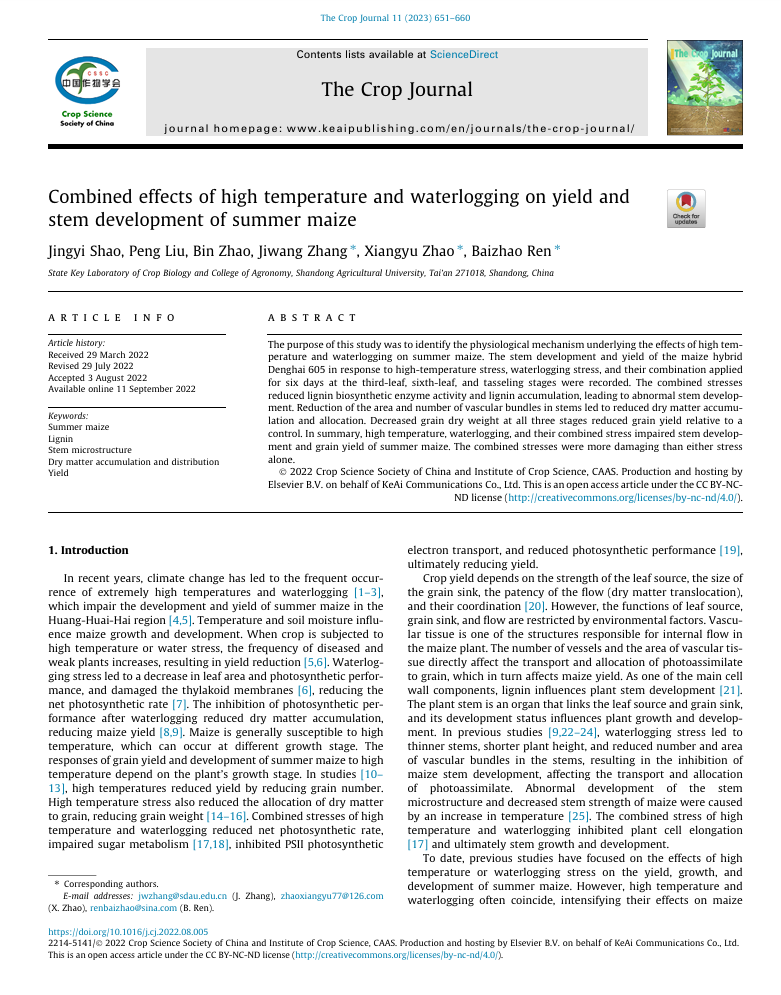 Combined effects of high temperature and waterlogging on yield and stem development of summer maize. The crop journal