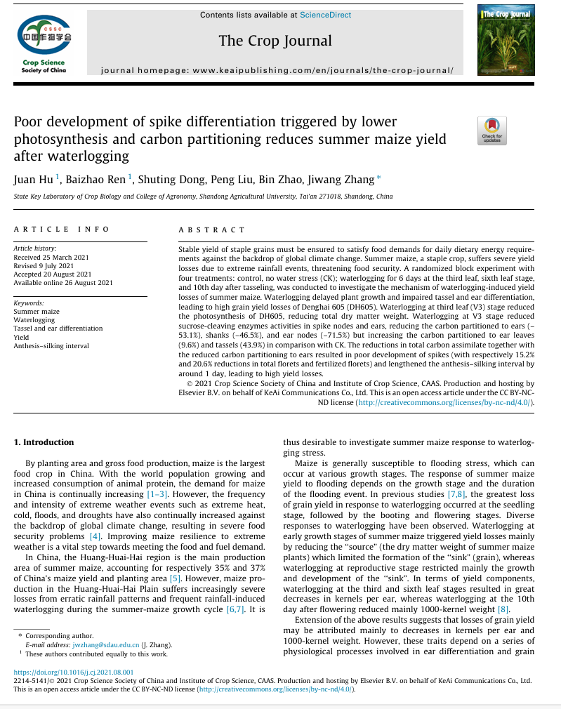 Poor development of spike differentiation triggered by lower photosynthesis and carbon partitioning reduces summer maize yield after waterlogging. The crop journal