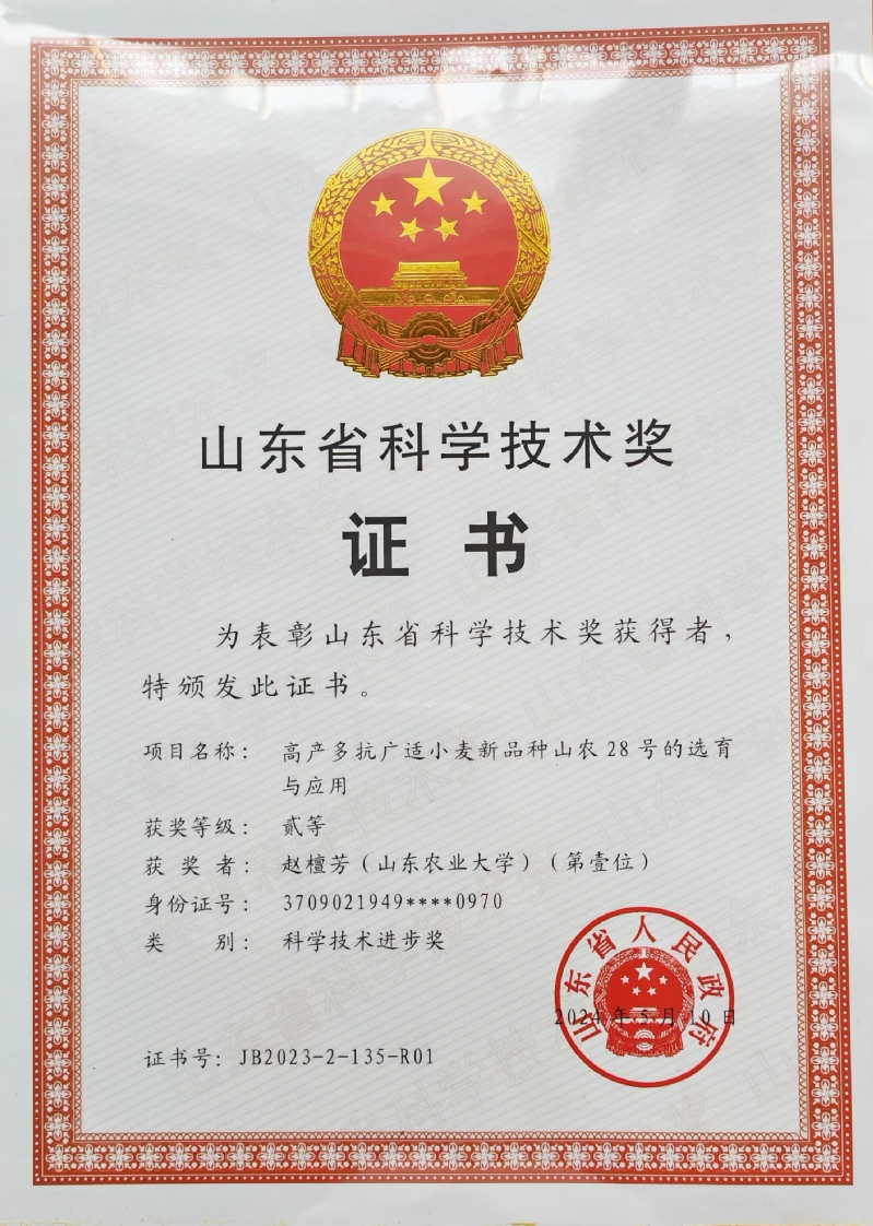 山东省科技进步二等奖-高产多抗广适小麦新品种山农28号的选育与应用