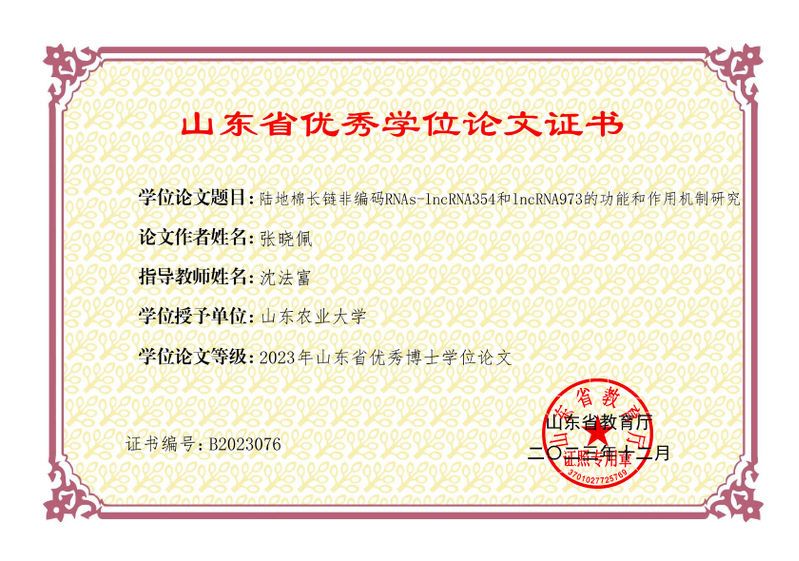 山东省优秀学位论文证书 张晓佩