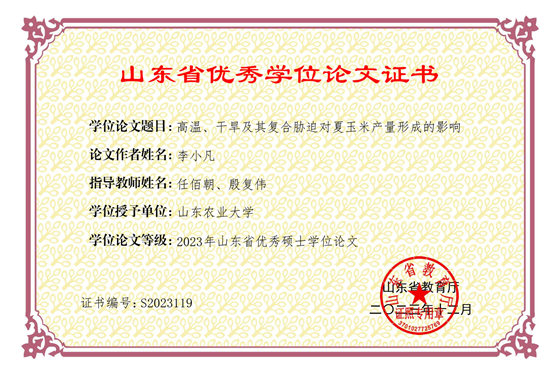 山东省优秀学位论文证书 李小凡