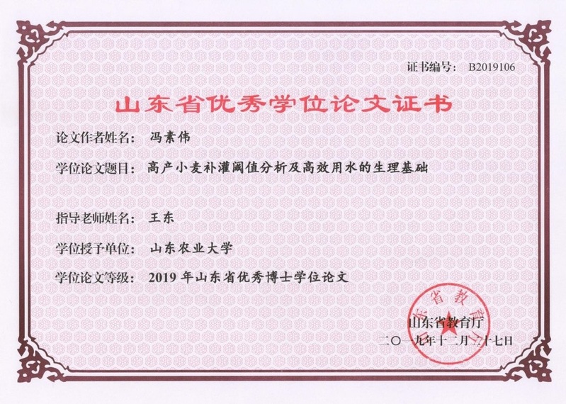 山东省优秀学位论文证书 冯素伟
