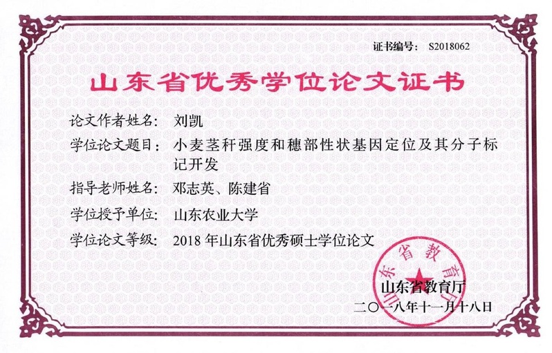 山东省优秀学位论文证书 刘凯