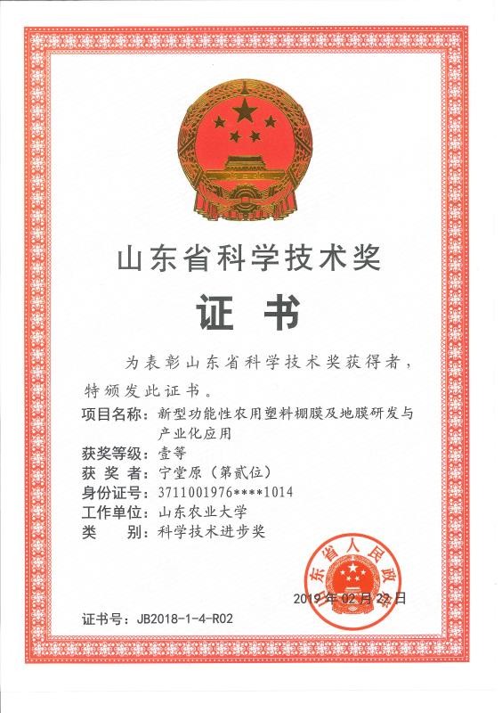 山东省科技进步一等奖-新型功能性农用塑料棚膜及地膜研发与产业化应用